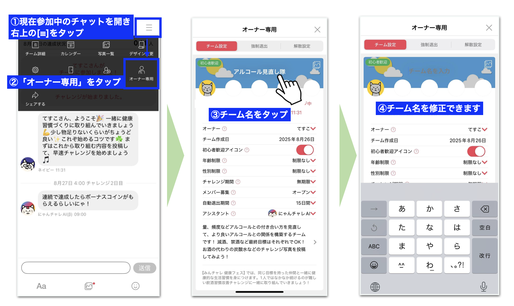 チャット画面の右上のメニュー→[オーナー専用 ] → [ チーム設定 ] からチームの設定を変更することができます。